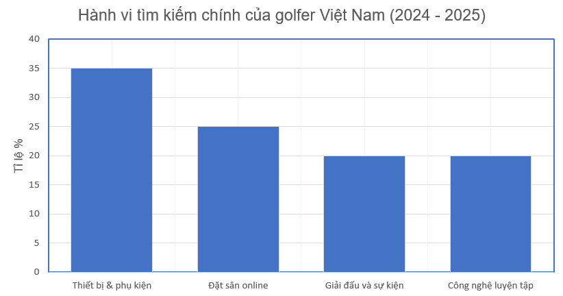 Trong khi đó, hành vi tìm kiếm của golfer trong nước lại phác họa một bức tranh khác. Chúng thiên về thiết bị, ứng dụng đặt sân và trải nghiệm thi đấu: